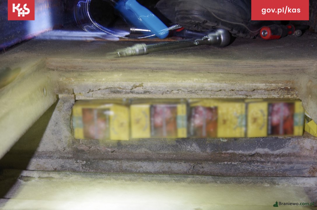 To jednak nie zmyliło funkcjonariuszy i podczas dalszej rewizji, ujawnili starannie przygotowaną, wielowarstwową skrytkę w podłodze autokaru, ukrytą pod wykładziną i fabrycznym sejfem, zabezpieczoną mechanicznie ryglem, śrubami oraz dodatkowymi osłonami. W jej wnętrzu znajdowało się 18,9 tys. szt. papierosów bez polskich znaków akcyzy.