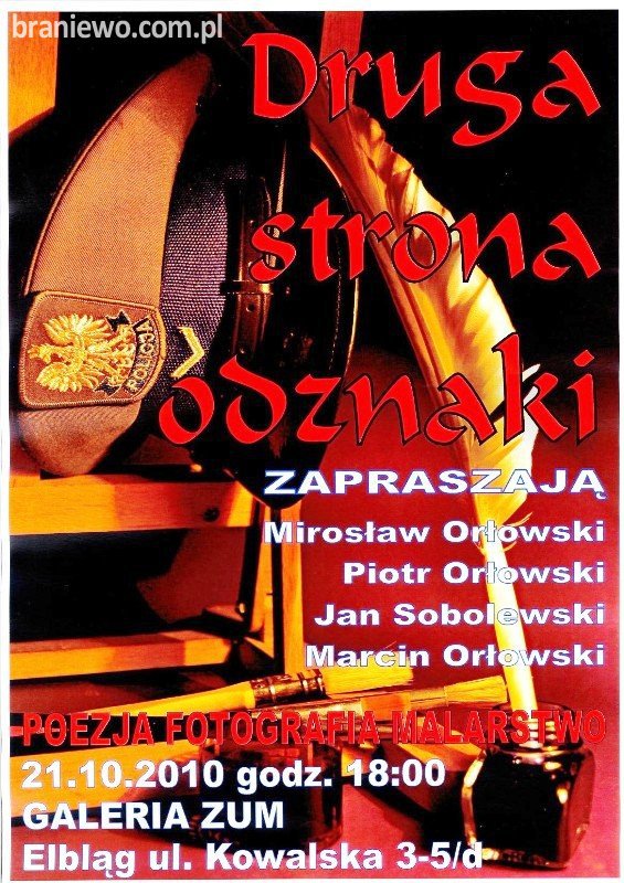 21 października 2010 r. o godz. 18.00 w elbląskiej galerii ZUM odbędzie się wernisaż wystawy Druga strona odznaki. Swoją poezję, fotografię i malarstwo zaprezentują nasi policjanci mł. asp. Jan Sobolewski, mł. asp. Marcin Orłowski, sierż. szt. Piotr Orłowski i mł. asp. Mirosław Orłowski.