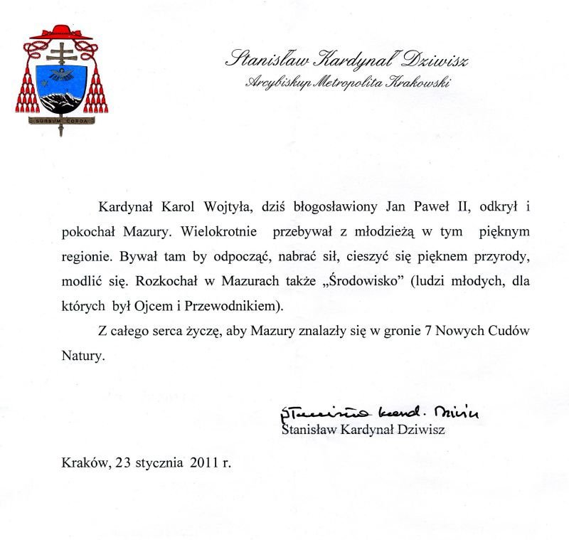 Metropolita krakowski, Ksiądz Kardynał Stanisław Dziwisz, dawny sekretarz osobisty Jana Pawła II przyjął 23 stycznia 2011 r. na specjalnym spotkaniu Jacka Pałkiewicza. Ambasador Mazur w ramach kampanii Siedem Cudów Natury otrzymał od hierarchy słowa wsparcia dla promocji narodowego kandydata do siódemki najpiękniejszych miejsc planety stworzonych siłami przyrody.