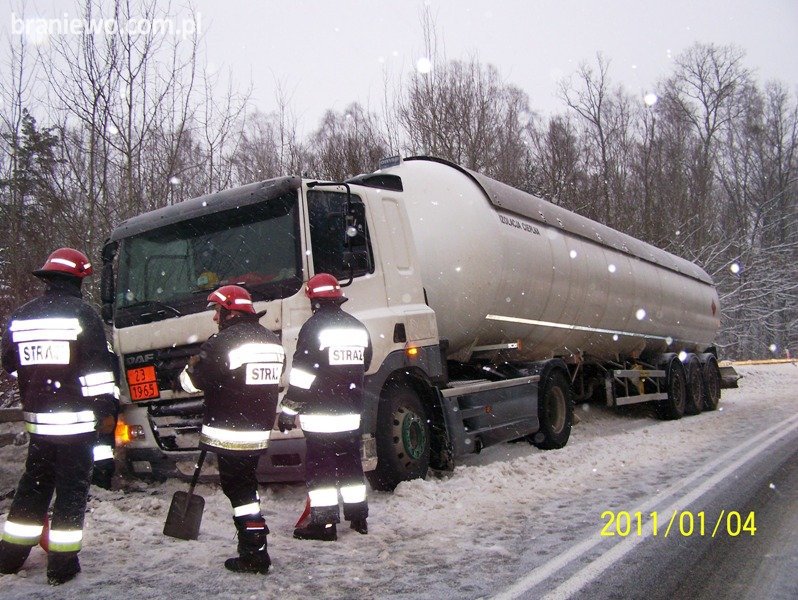 We wtorek 04.01.2011 o godz. 09.00 braniewscy strażacy zostali poinformowani o zdarzeniu drogowym z udziałem pojazdu ciężarowego marki DAF przewożącego gaz propan butan.