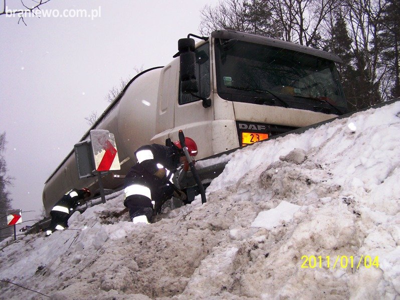 We wtorek 04.01.2011 o godz. 09.00 braniewscy strażacy zostali poinformowani o zdarzeniu drogowym z udziałem pojazdu ciężarowego marki DAF przewożącego gaz propan butan.