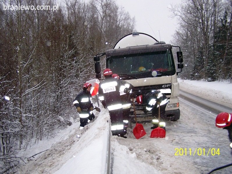 We wtorek 04.01.2011 o godz. 09.00 braniewscy strażacy zostali poinformowani o zdarzeniu drogowym z udziałem pojazdu ciężarowego marki DAF przewożącego gaz propan butan.