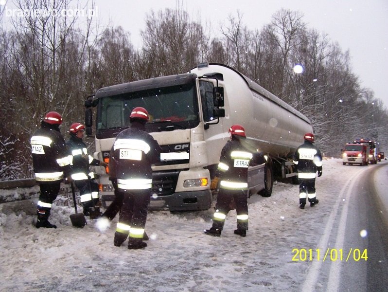 We wtorek 04.01.2011 o godz. 09.00 braniewscy strażacy zostali poinformowani o zdarzeniu drogowym z udziałem pojazdu ciężarowego marki DAF przewożącego gaz propan butan.