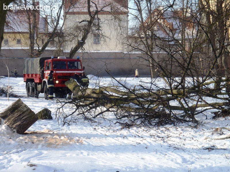 We wtorek kilka minut po godzinie czternastej braniewscy strażacy otrzymali zgłoszenie o pochylonym drzewie znajdującym się na terenie remontowanego amfiteatru miejskiego.