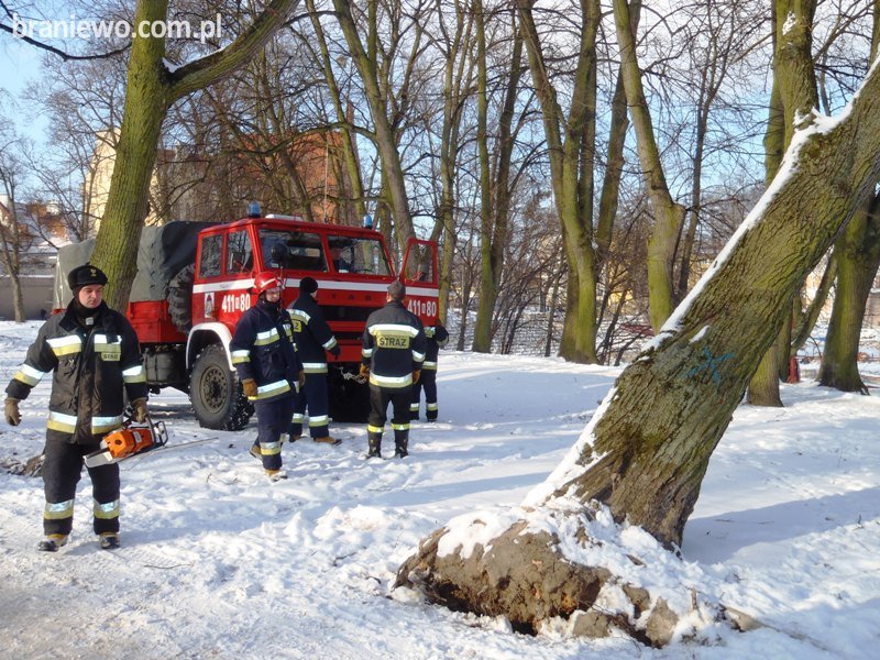We wtorek kilka minut po godzinie czternastej braniewscy strażacy otrzymali zgłoszenie o pochylonym drzewie znajdującym się na terenie remontowanego amfiteatru miejskiego.
