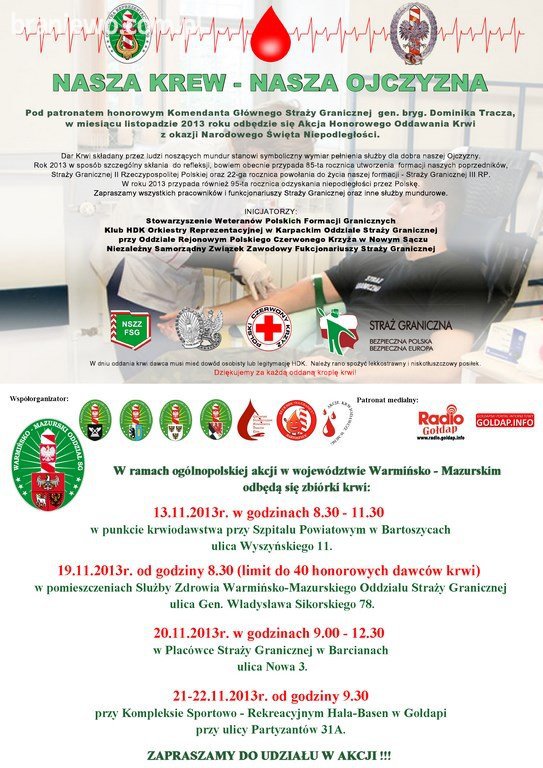Od dzisiaj rozpoczęły się zbiórki krwi na Warmii i Mazurach w ramach ogólnopolskiej akcji Nasza Krew - Nasza Ojczyzna,której patronuje Komendant Główny Straży Granicznej gen.bryg.SG Dominik Tracz.