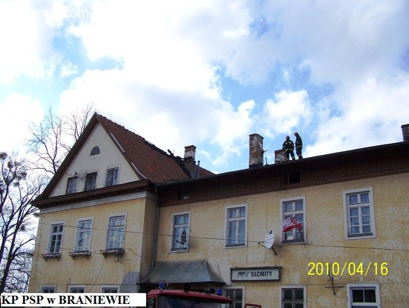 W piątek 16 kwietnia 2010r o godzinie 15.03 Powiatowe Stanowisko Kierowania w Braniewie otrzymało zgłoszenie o pożarze poddasza budynku byłego dworca kolejowego w Słobitach gmina Wilczęta.