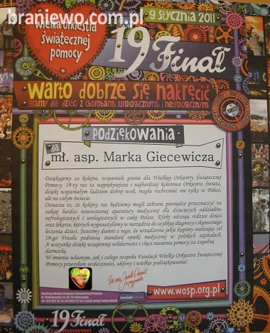 Policjanci otrzymali podziękowania od Wielkiej Orkiestry Świątecznej Pomocy za wspólne granie na rzecz chorych dzieci. W 19 Finale policjanci przekazali do braniewskiego sztabu Orkiestry prawie 1200 zł. Największe kwoty uzyskaliśmy dzięki Państwa licytacji obrazów braniewskich policjantów.Ta kwota została zebrana dzięki ofiarności braniewian, a więc te podziękowania przekazujemy również na Wasze ręce.
