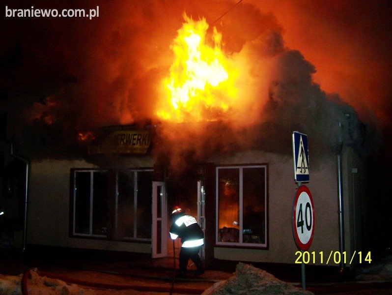 W dniu 14.01.2011r., o godz. 02.03 braniewscy strażacy otrzymali zgłoszenie o pożarze sklepu wielobranżowego w miejscowości Pieniężno ul. 1 Maja.