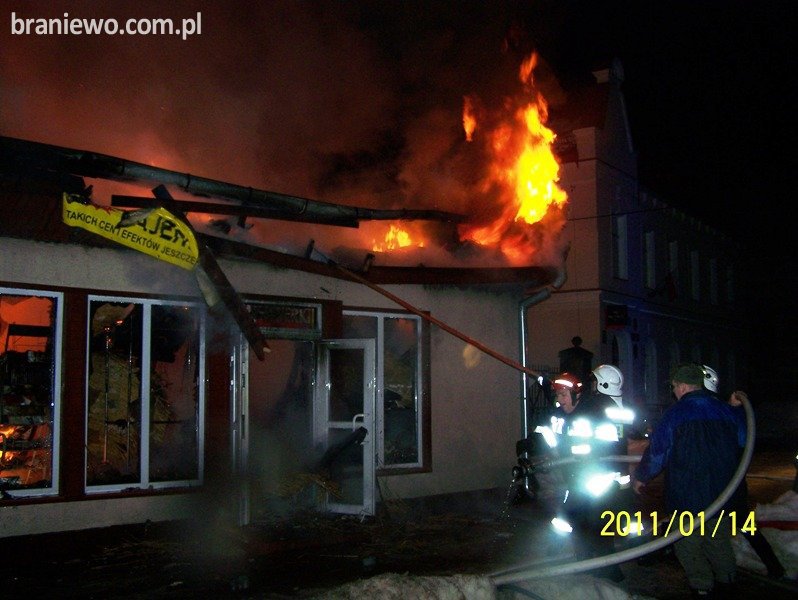 W dniu 14.01.2011r., o godz. 02.03 braniewscy strażacy otrzymali zgłoszenie o pożarze sklepu wielobranżowego w miejscowości Pieniężno ul. 1 Maja.