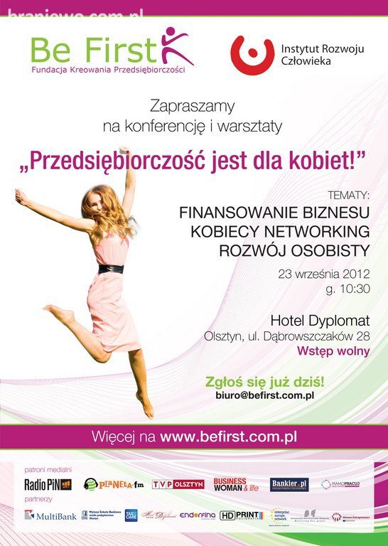 Fundacja Be First oraz Instytut Rozwoju Człowieka organizują 23 września w Olsztynie w Hotelu Dyplomat konferencję i warsztaty pn. Przedsiębiorczość jest dla kobiet!