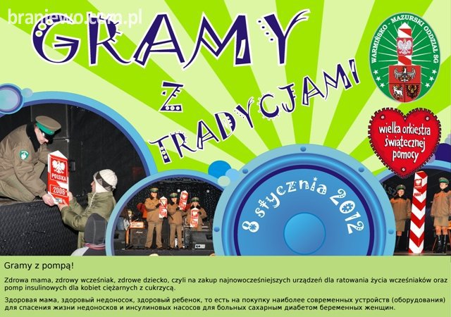 Tegoroczne hasło towarzyszące udziałowi Warmińsko-Mazurskiego Oddziału SG w 20. Finale Wielkiej Orkiestry Świątecznej Pomocy brzmi: Gramy z tradycjami. Tradycją bowiem już jest, że wspieramy szczytną ideę Orkiestry. W niedzielę 8 stycznia br. będziemy towarzyszyć organizatorom w Olsztynie, Kętrzynie, Braniewie, Górowie Iławeckim, Bartoszycach, Węgorzewie i Gołdapi.