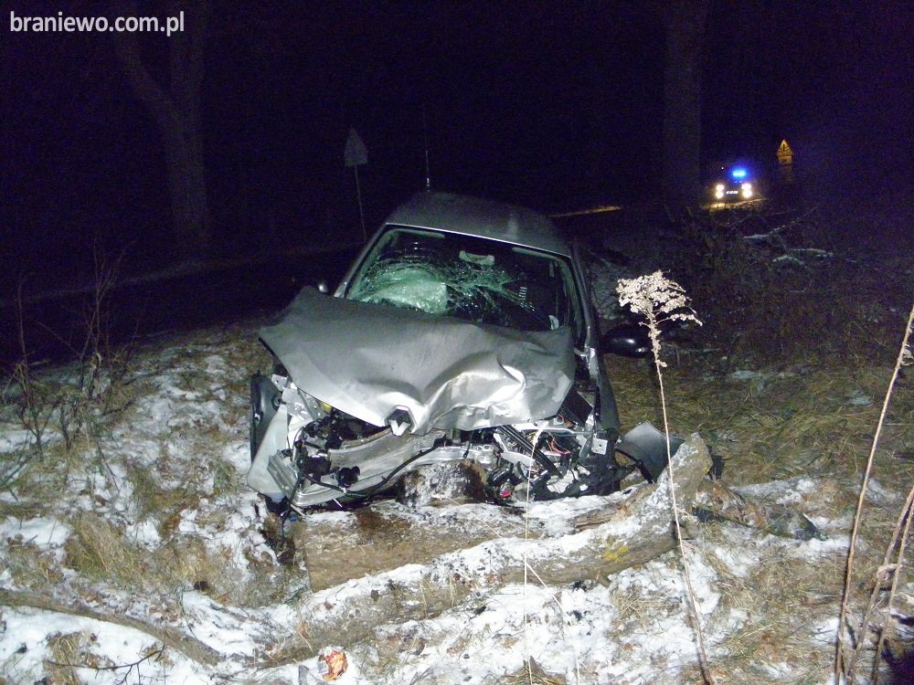 Braniewscy policjanci pracowali na miejscu wypadku drogowego, do którego doszło na drodze Braniewo-Lipowina. 44-letni mężczyzna stracił panowanie nad samochodem i uderzył w przydrożne drzewo. W wyniku uderzenia kierujący autem doznał obrażeń ciała i trafił do szpitala.