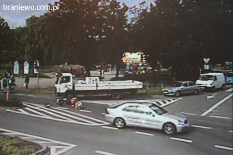 Policjanci wyjaśniają okoliczności wypadku, do którego doszło dzisiaj (26 sierpnia) o godzinie 10.20 w Braniewie na głównym skrzyżowaniu. 31 - letni motorowerzysta przewrócił się na ulicy, ponieważ wystraszył się samochodu ciężarowego, który chciał wyjechać z ulicy Piłsudskiego. Całe zdarzenie zarejestrowała kamera miejskiego monitoringu.