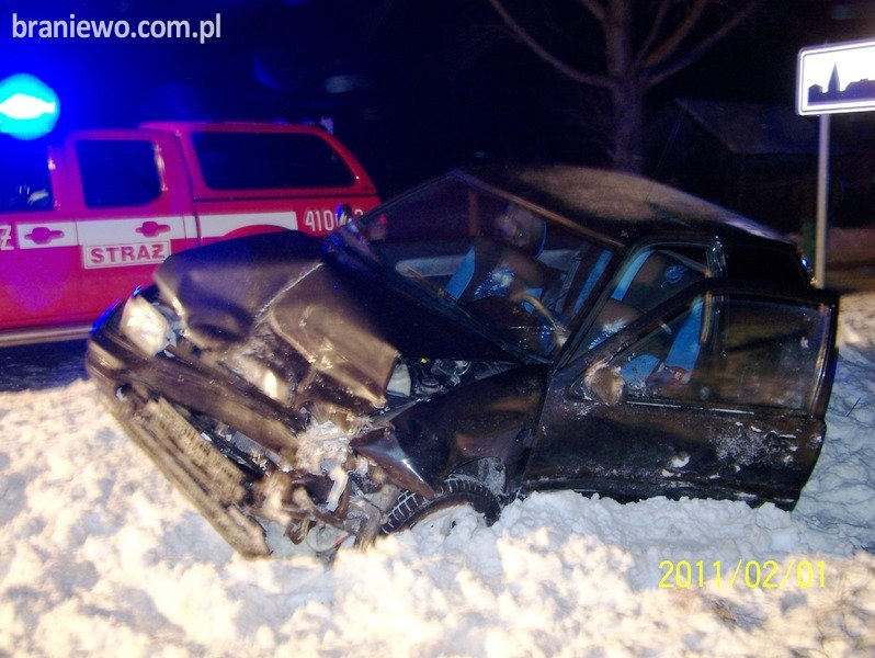 We wtorek 01.02.2011r., o godz. 16.39 braniewscy strażacy otrzymali zgłoszenie o wypadku drogowym z udziałem dwóch pojazdów osobowym: Daihatsu Charade oraz Volvo V40.