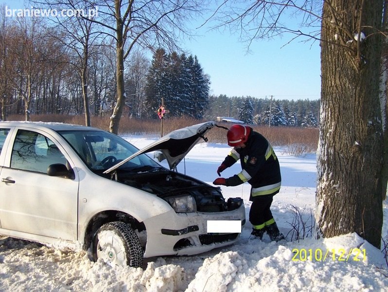 We wtorek 21.12.2010r., o godz. 12.49 braniewscy strażacy otrzymali zgłoszenie o wypadku drogowym z udziałem pojazdu osobowego marki Skoda Fabia.