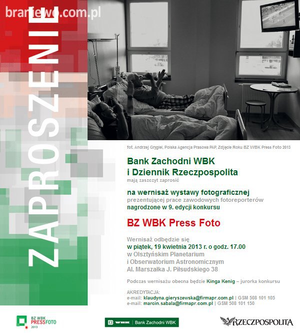 Już od 19 kwietnia przez półtora miesiąca Olsztyńskie Planetarium i Obserwatorium Astronomiczne będzie gościć prace nagrodzone w 9. edycji konkursu fotograficznego BZ WBK Press Foto. Tegoroczny konkurs cieszył się zainteresowaniem kilkuset fotografów i fotoreporterów z całej Polski. Nagrodzone zdjęcia będzie można oglądać w Olsztynie do 5 czerwca br.